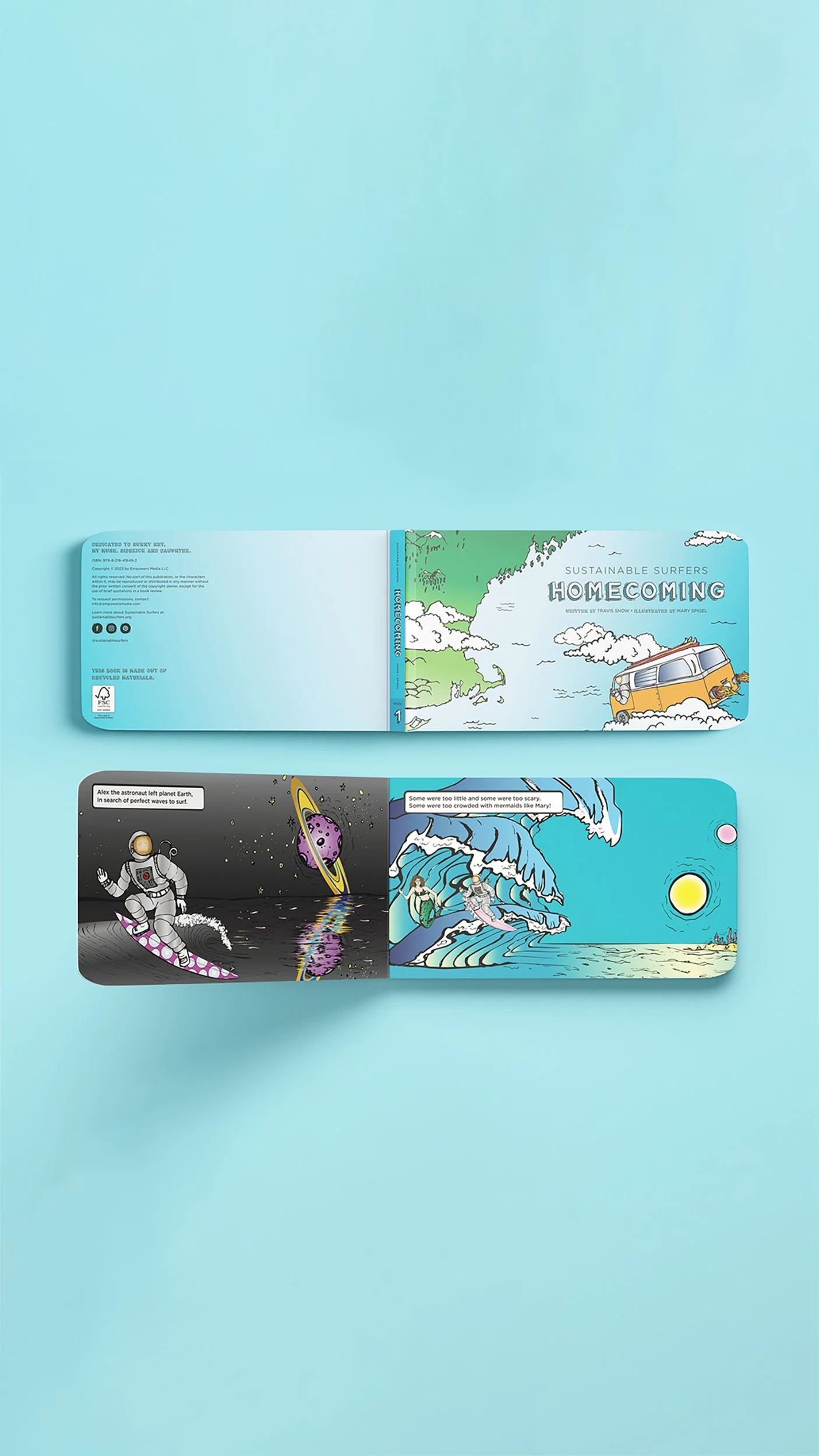 Homecoming is the first book in the Sustainable Surfers series; an educational series that teaches children of all ages the importance of cleaning up after themselves and others to sustain the health of our oceans.